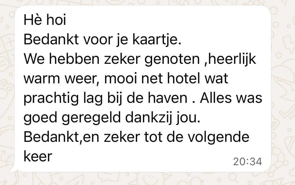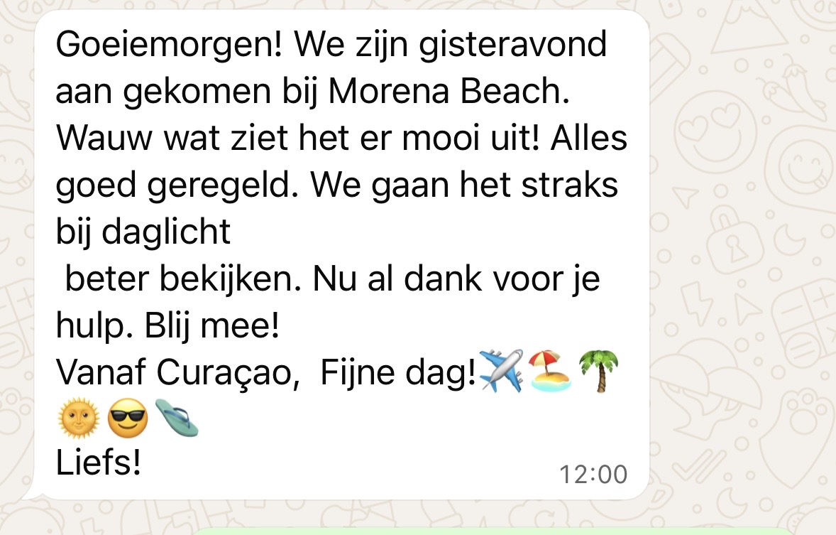 Ondersteuning op elk moment: Mijn betrokkenheid eindigt niet zodra je boekt. Ik ben beschikbaar om vragen te beantwoorden, eventuele wijzigingen aan te brengen en zelfs om je te assisteren tijdens je reis, mocht dat nodig zijn. Ook op afspraak in de avonduren en in het weekend